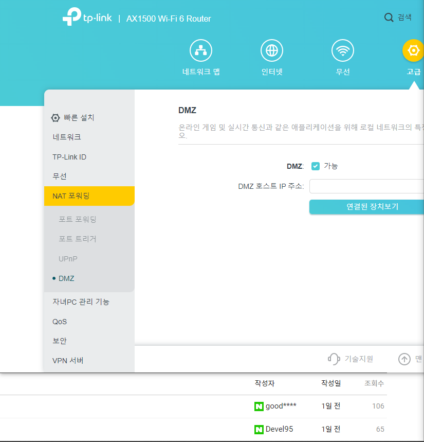 공유기 설정의 [NAT 설정] - [DMZ 서버] 경로를 들어가보시겠어요?