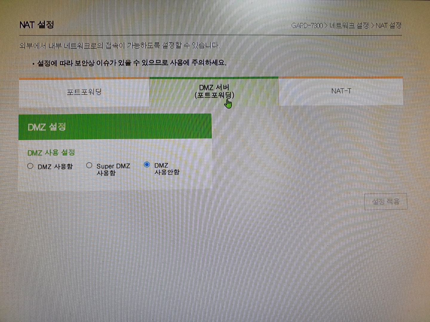 이후 페이지에 "Super DMZ 사용함" 버튼이 있는지 한 번 살펴보시고 캡쳐화면을 저에게 보여주시면 좋겠습니다~! :)