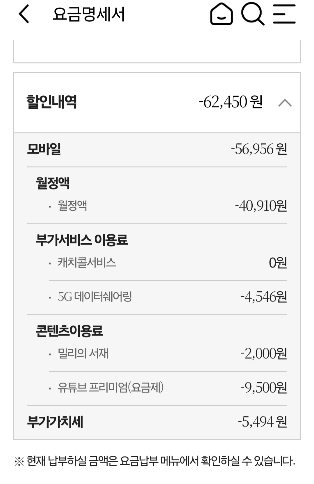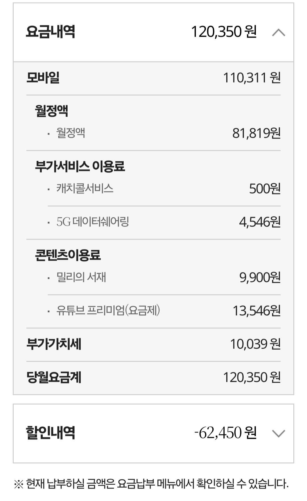 모바일요금(밀리의서재,유튜브는 제외하고 봐주세요)