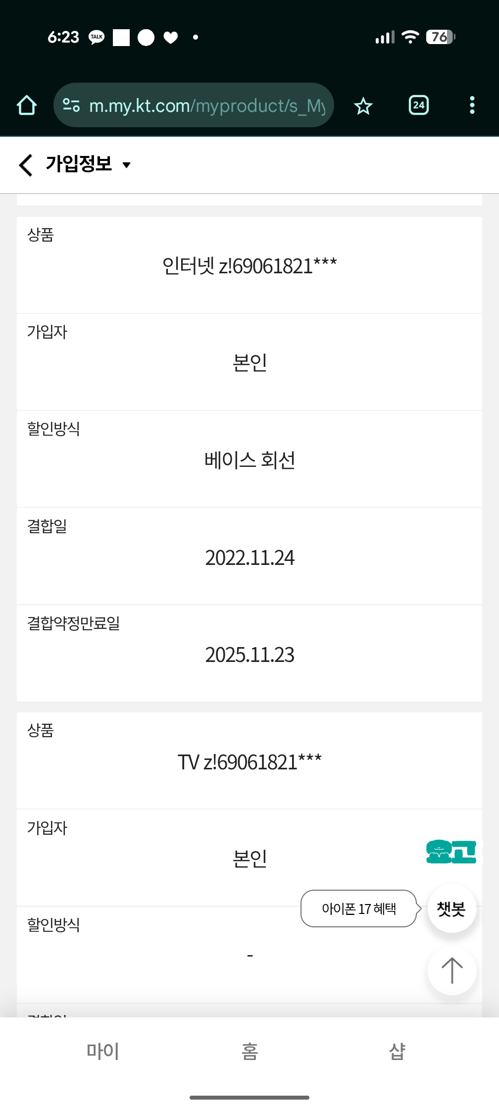 현재 kt인터넷+tv 이용중이고, 핸드폰까지 결합되어 있습니다.