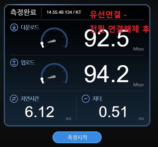 공유기를 배제하고 모뎀 <-> PC를 직결할 때 속도도 측정해주세용)