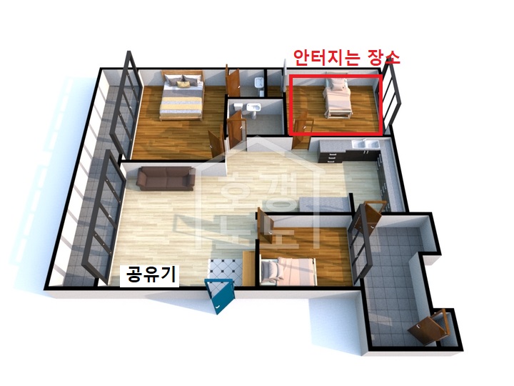 공유기가 설치된 거실에서 가장 먼 방(빨간박스)에서만 와이파이 품질이 뚝 떨어집니다.