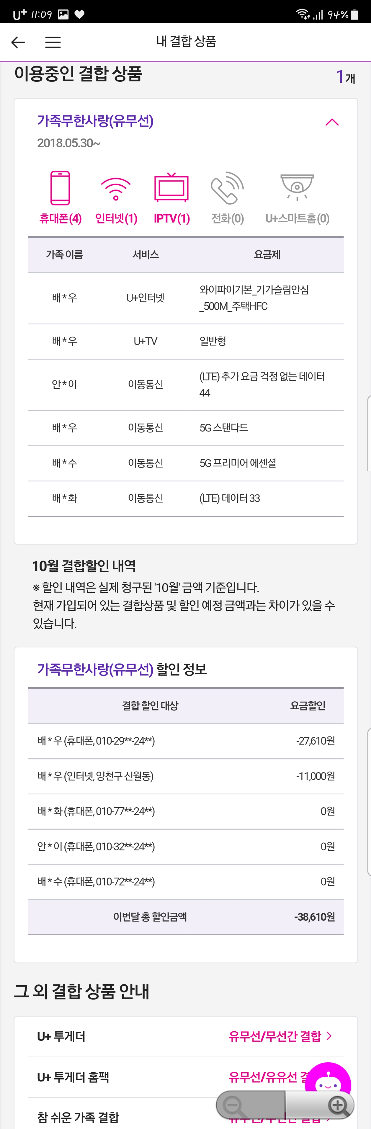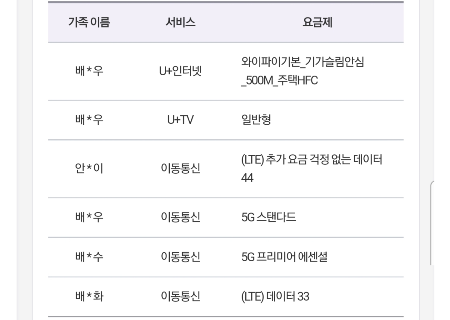 저번 문의에 "저랑 동생은 5G 스마트 / 부모님들은 추가요금걱정없는 44"를 사용하신다고 말씀하셨는데,