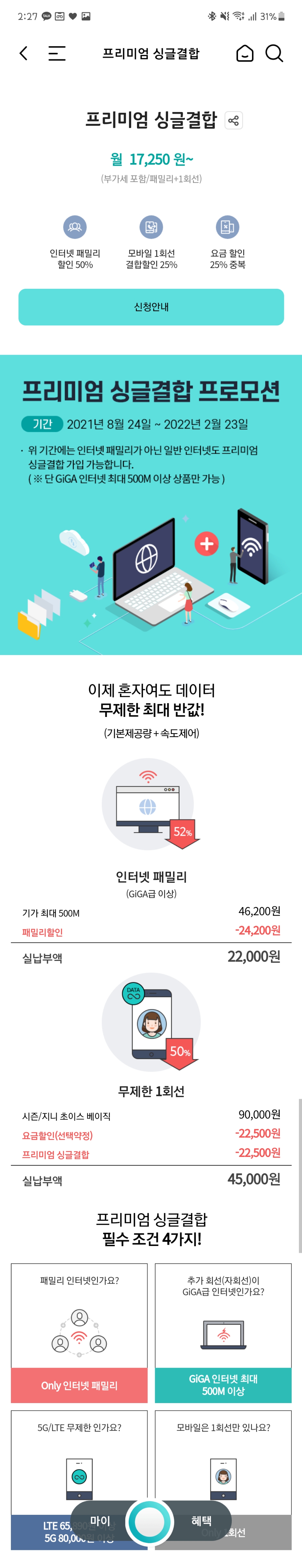 프리미엄 싱글결합은 혜택이 낭낭하지만, 그만큼 까다로운 조건을 내걸고 있거든요;;