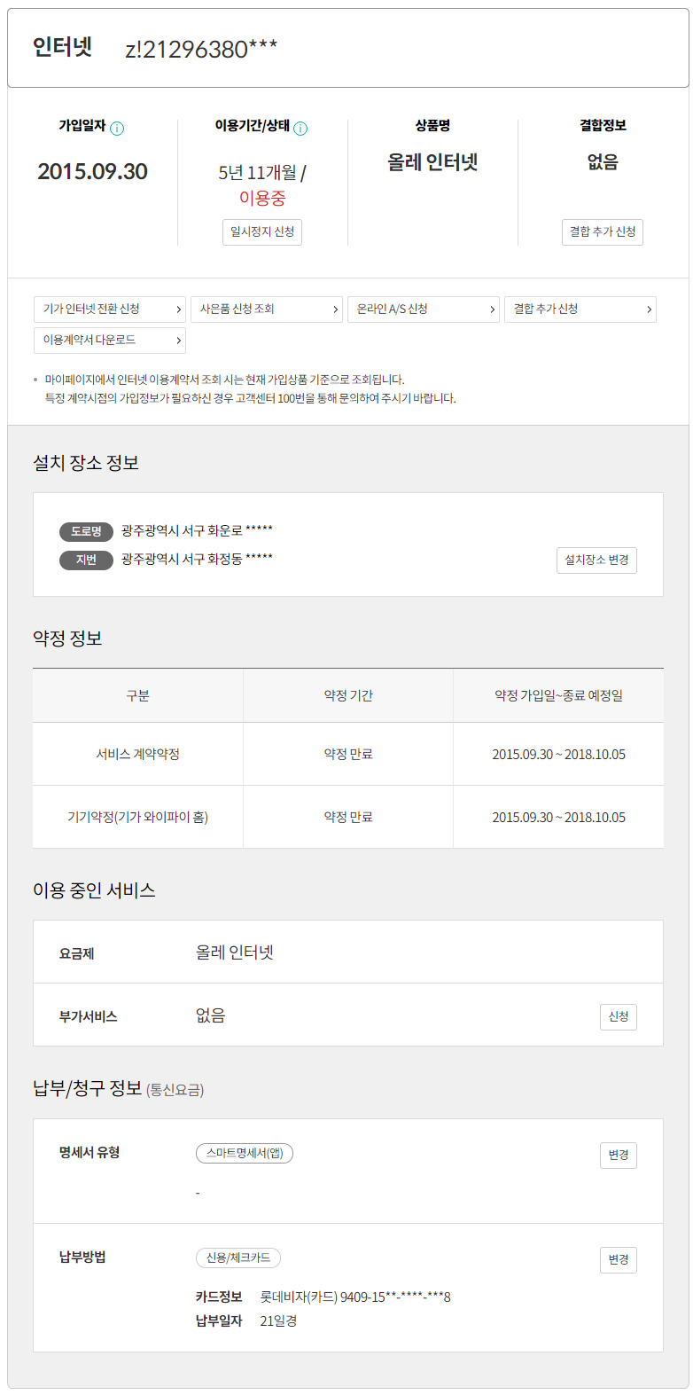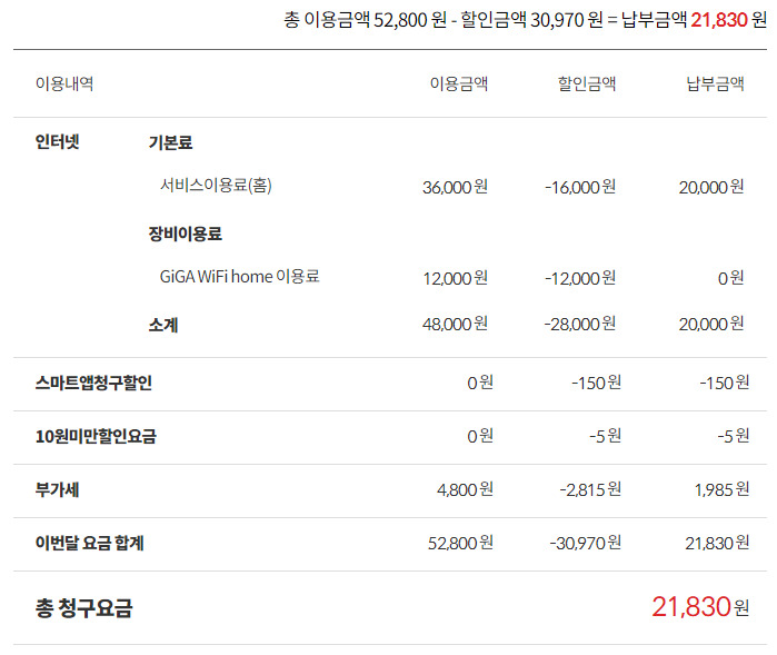 요금: 올레인터넷 GiGA Wifi home (52,800원)을 30,970원 할인받아 21,830원에 이용중