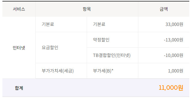 * 500메가 인터넷 요금 33,000원 → 11,110원 할인 → 21,890원