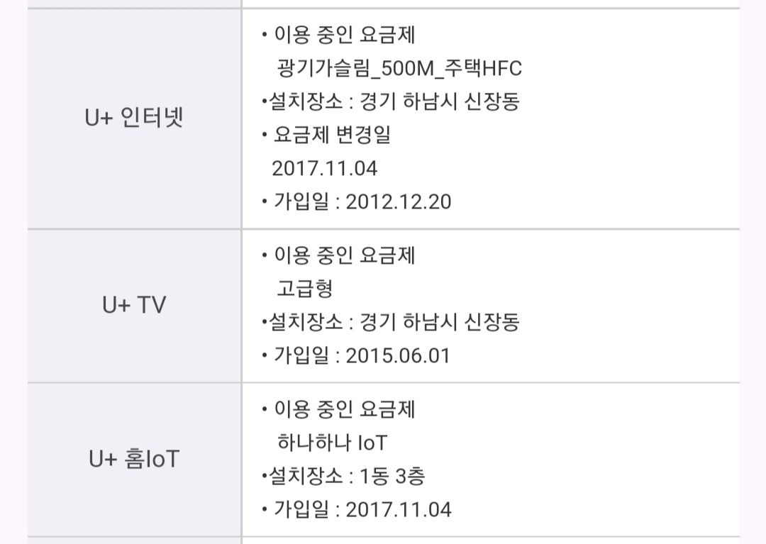 현재 인터넷/티브이/IOT맘카/휴대폰2대 결합하여 유플러스 사용하고 있고요 인터넷요금은 46,000원대로 이용하고 있습니다. 설치주소와 가입일은 첨부한 이미지 봐주시면 될거같아요.