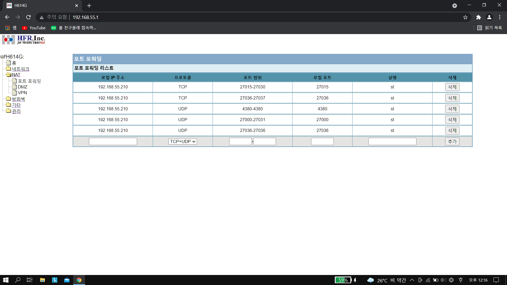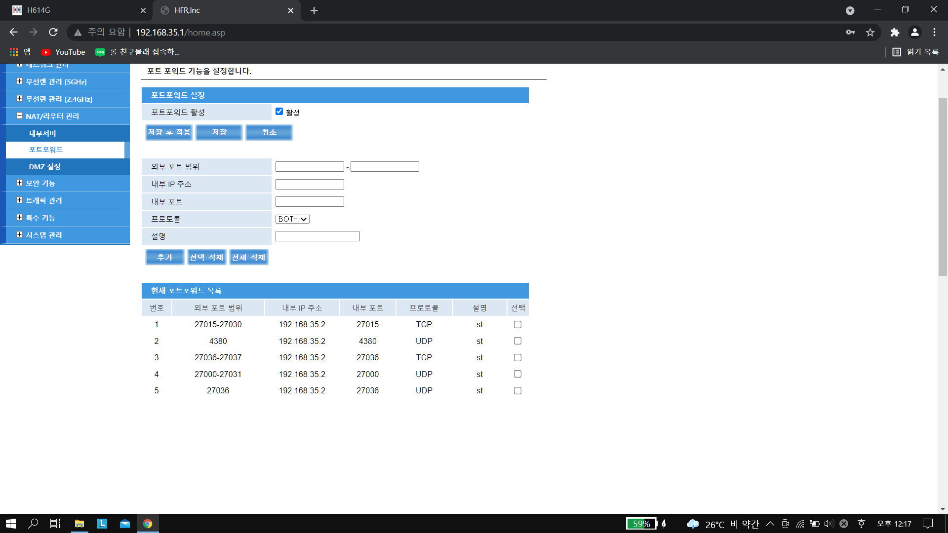 헌데,  r1aa1stjd님께서 캡쳐한 포트포워딩 설정은