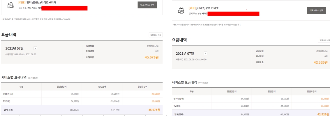 지금 제 이름으로 부모님집과 저희집 각각 다른장소에 인터넷 티비 결합으로 현재 sk브로드밴드 제품을 사용 하고 있는데