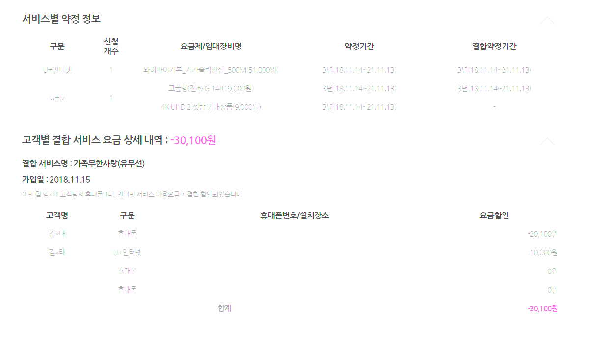 가족구성원 3명 다 LGU라서 가족무한사랑(유무선)으로 묶여있고요.