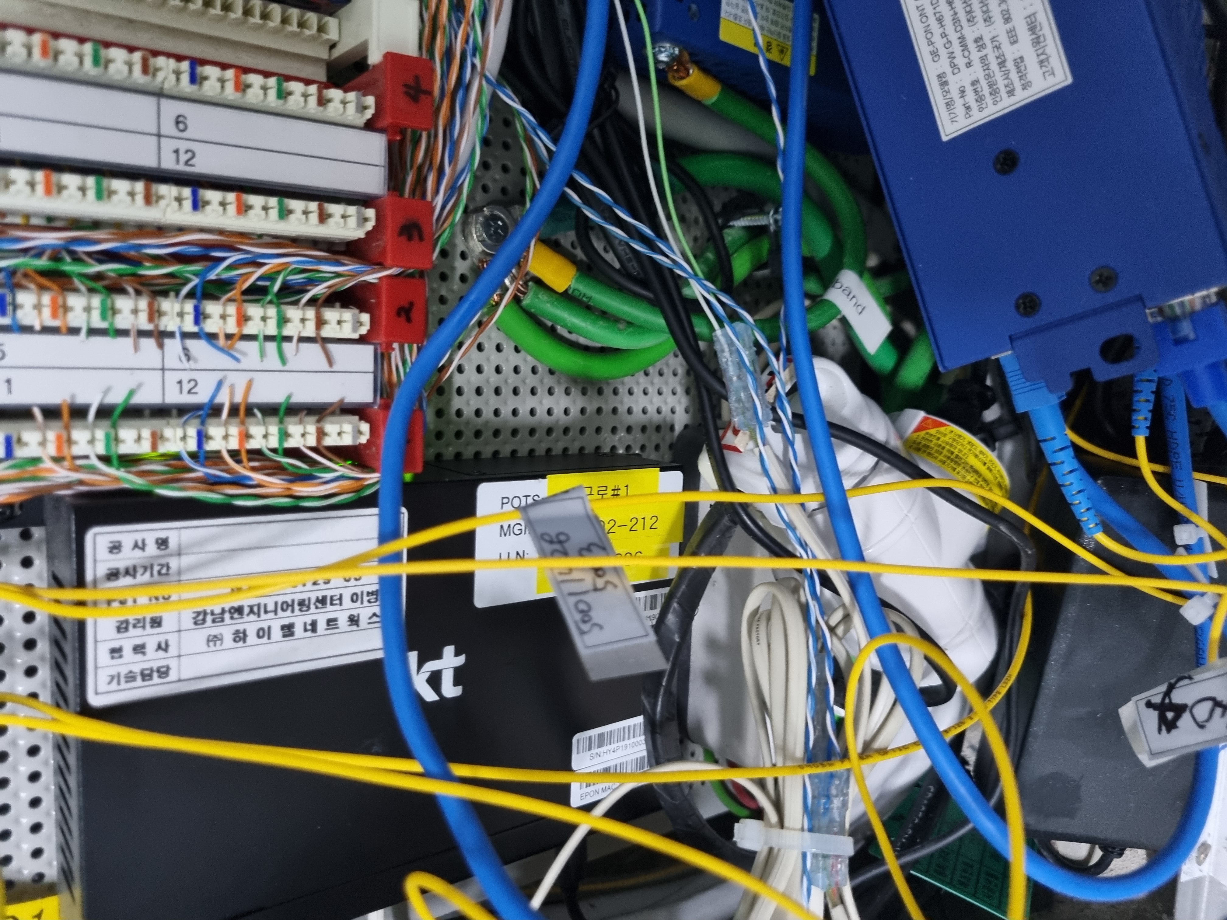 처음 설치 할 때 기사님 께서는 1기가설치가 불가능하다 하셨습니다, epon 장비를 확인해보니 광케이블 인입 되고 랜선으로 2가닥만 세대 utp 110블럭으로 들어가더군요 이게 원인일까요? e-pon 장비와 연결된 사진도 첨부합니다.
