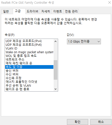 저기에 있는 속성들 설정도 해보고 전원관리쪽 설정도 해보고 cmd 설정, 랜카드 드라이버 삭제 후 재설치, 최신버전 설치, 혹시 몰라 바이오스 업데이트,