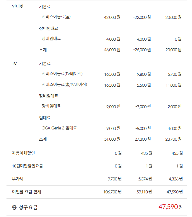 이전에 TV 2대 +인터넷 신규 한 뒤, 요새 납입하는 요금 명세서 보면 48070원이 나옵니다. (53,570원-5500원(프리미엄결합))