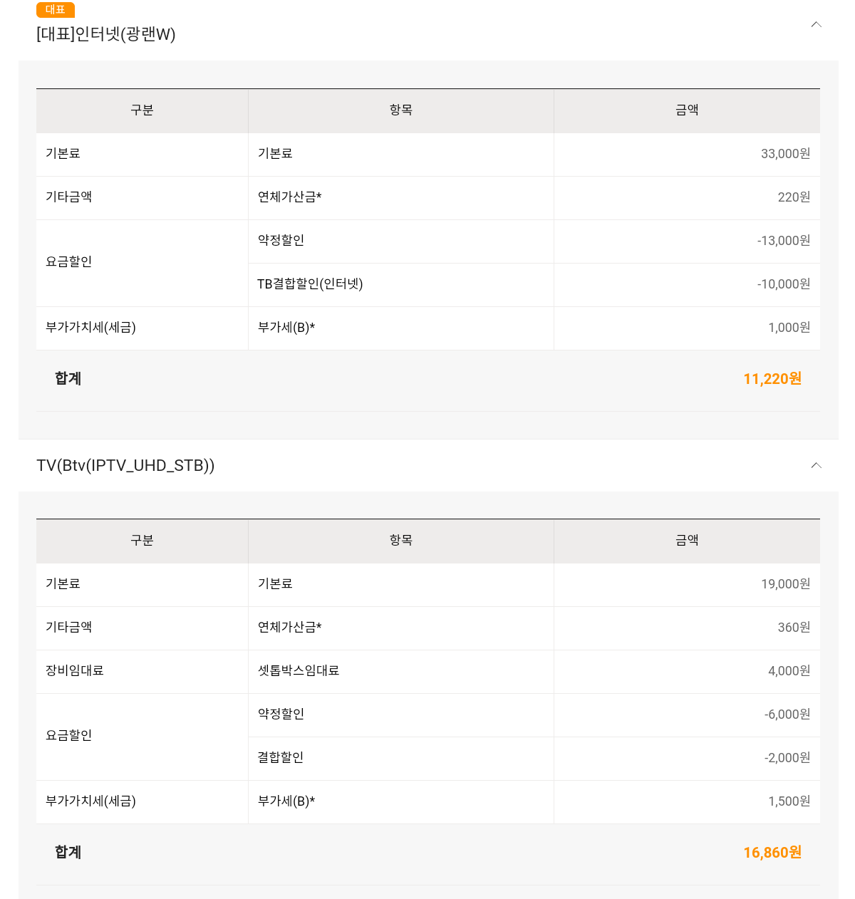 우선 현재 이용중인 SKB 상품(명의자 : 본인)의 상세할인 내역은 위와 같습니다. 지난 4월에 약정이 종료되어 현재는 무약정상태이며,