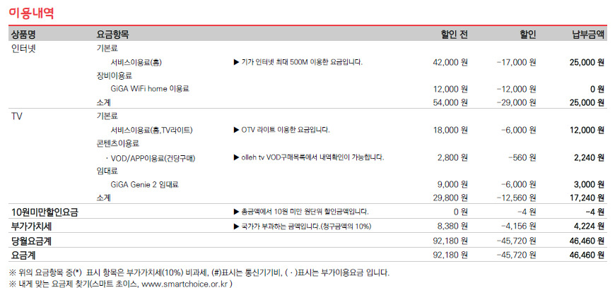 : 500메가 27,500원 + Lite (UHD스마트3) 17,600원 = 총 45,100원 부과