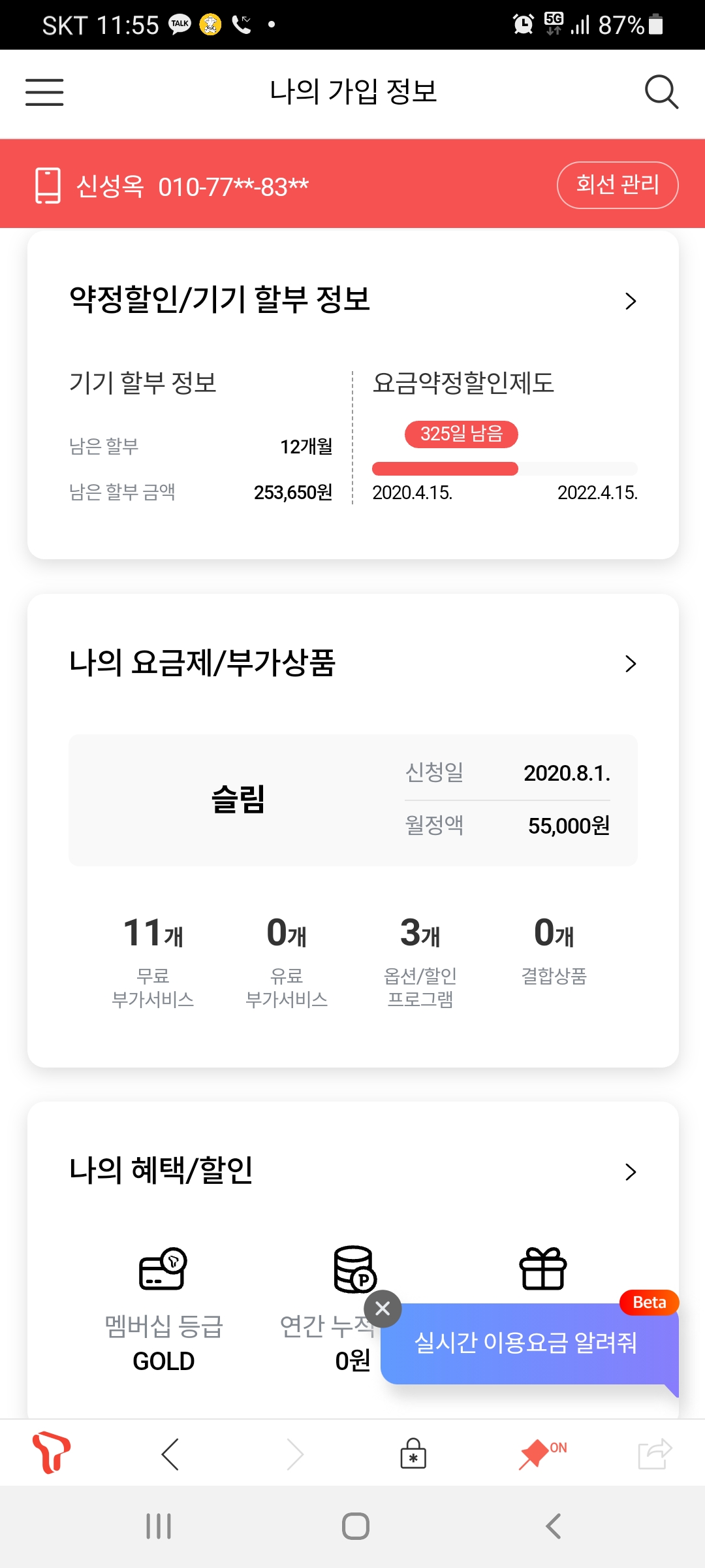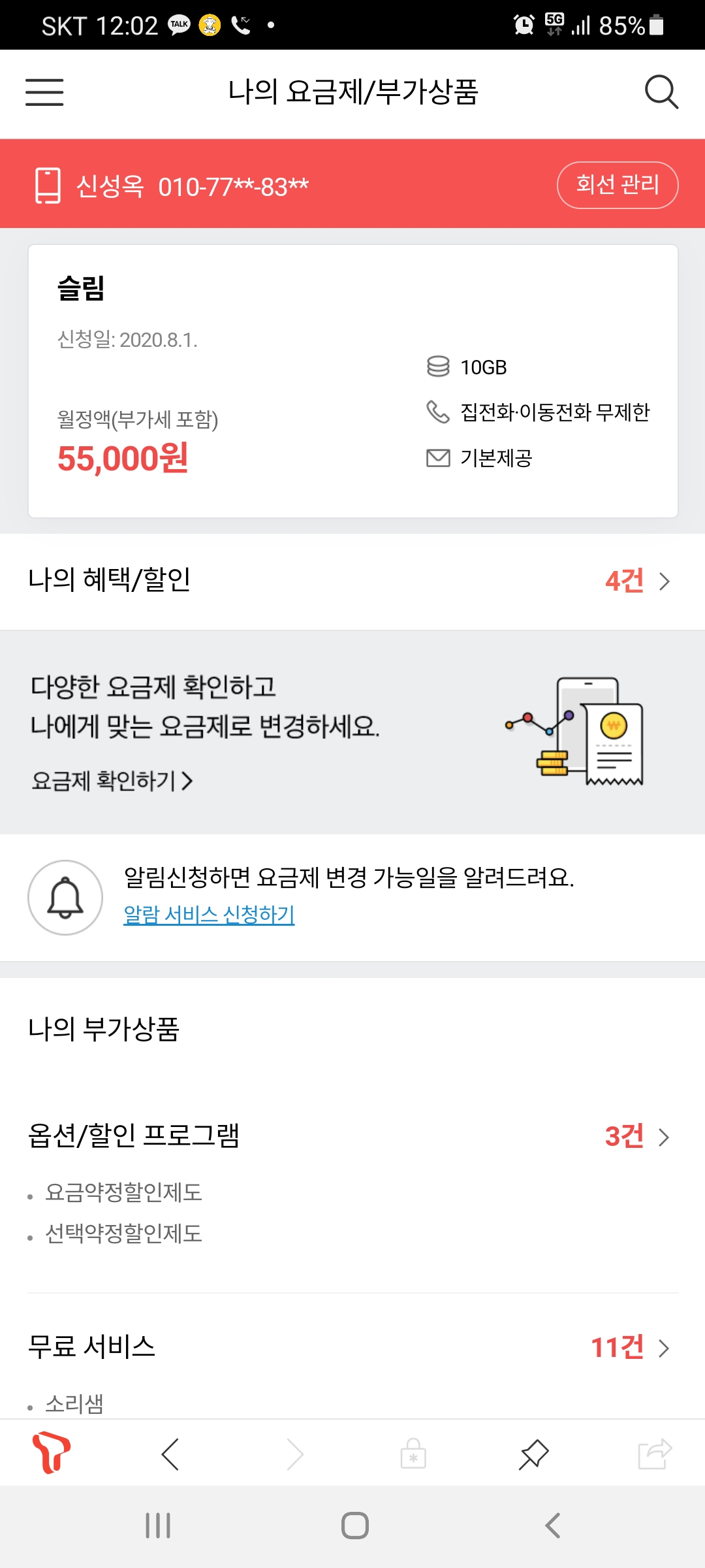 3. 휴대폰은 55,000원짜리(5G 슬림)를 이용하시나봐요!