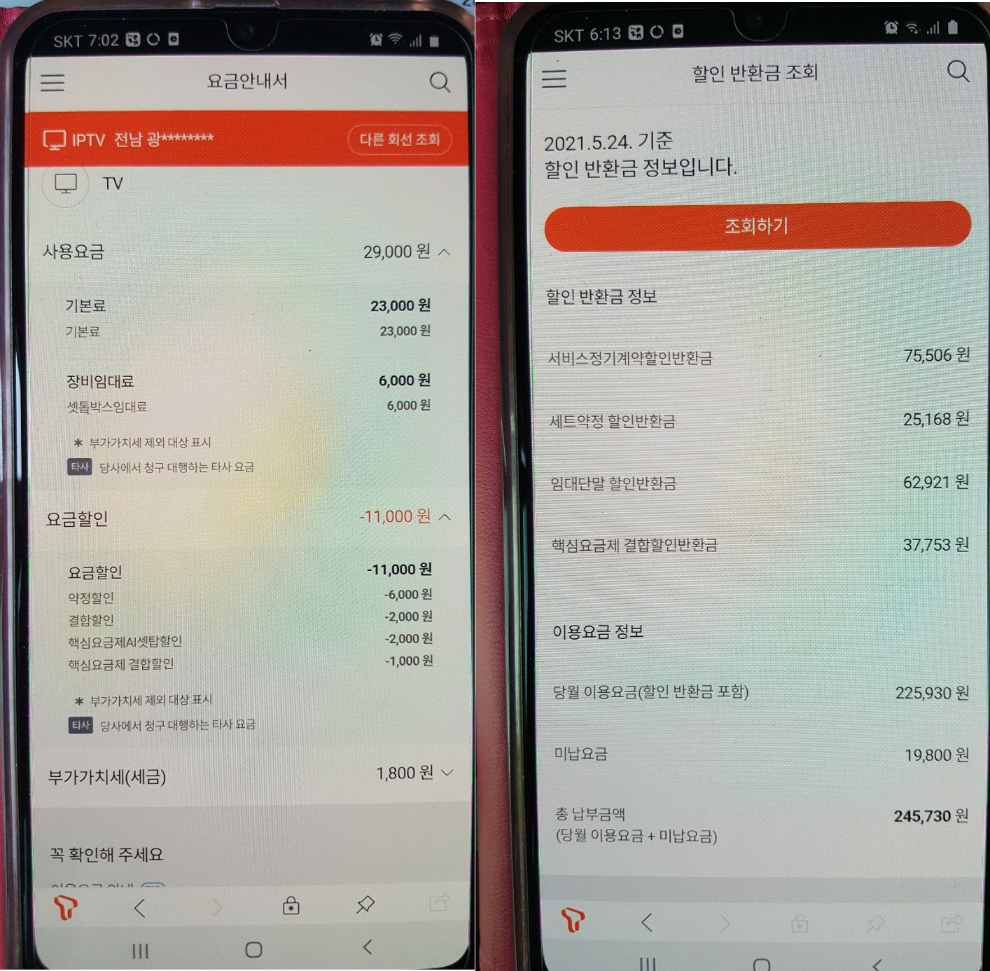 다른 할인 요금들은 T월드 가입정보에 할인내역으로 나오는데, "임대단말할인 반환금"은 어디에도 내역이 없었습니다.