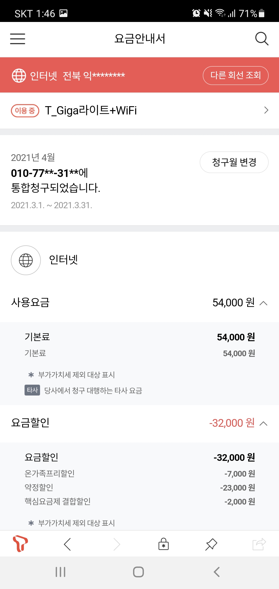 여기에 명의자분의 SK폰 1회선을 '온가족프리' 로 결합중이신데요..!