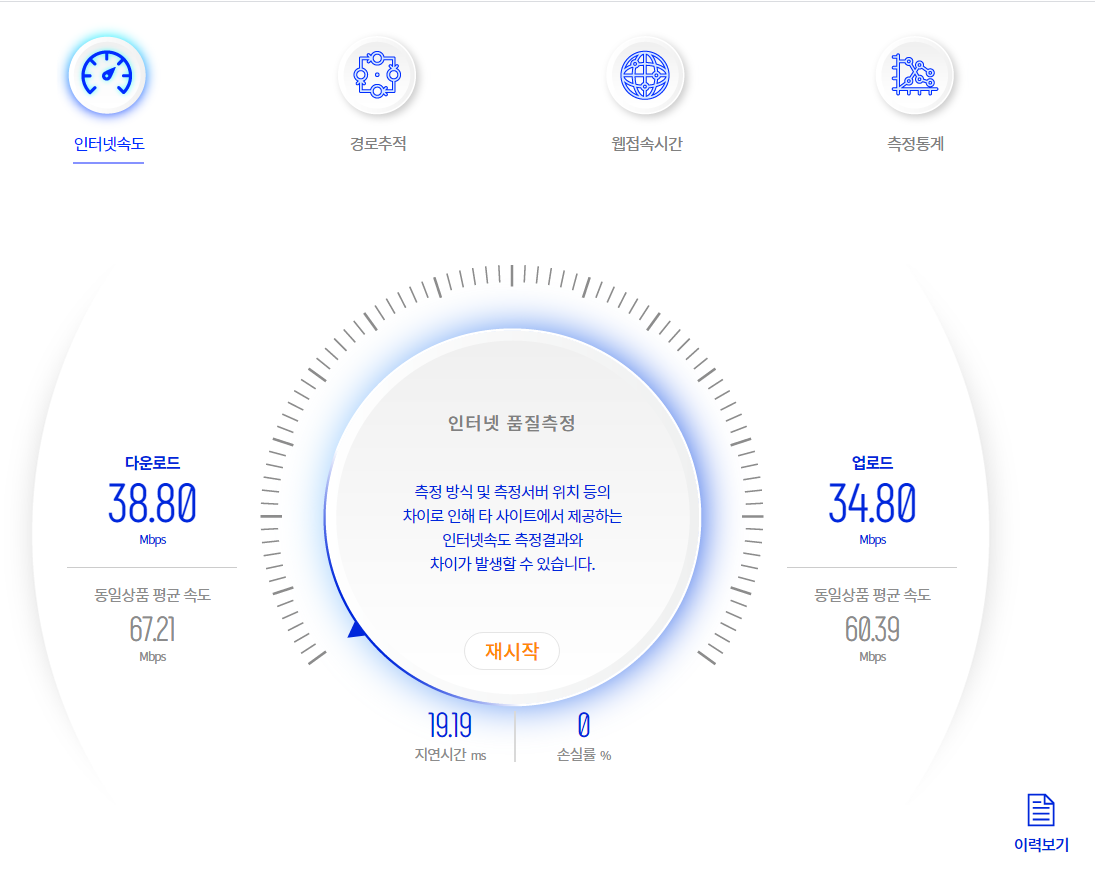 ▲ 모뎀, 공유기 초기화 후 KT 전화하여 재신호 발송 후 측정 결과.