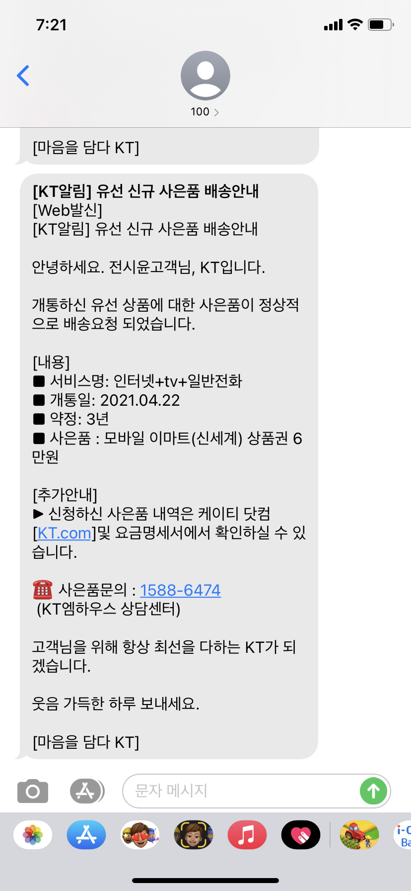 안녕하세요 사은품 메세지를 받았는데 안내받은 내용과 달라서 댓글 남겨요 백메가에서는 이마트 상품권 8만원으로 안내받고 신청했는데 케이티 메세지에는 6만원으로 기재되어 있어요 첨부파일 확인해보시고 문자 남겨주세요