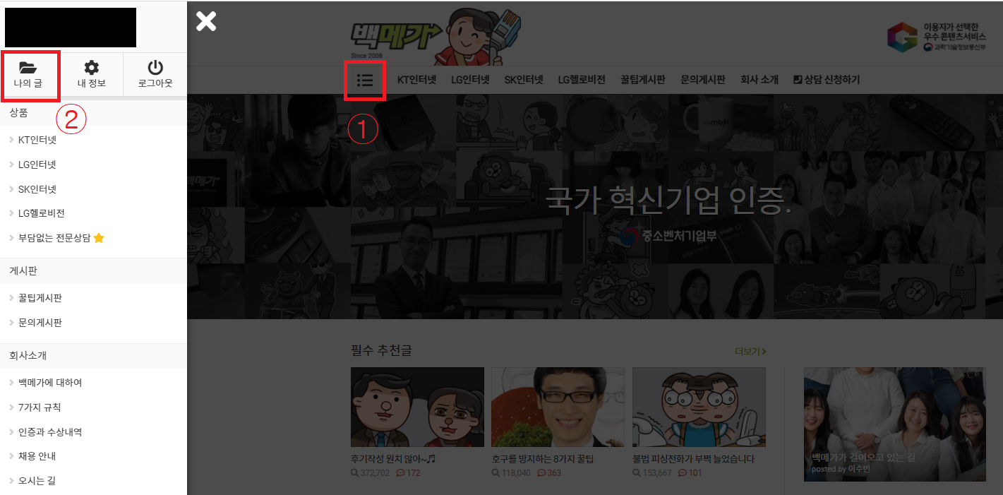 바로 상단의 백메가 로고 아래 三자 버튼을 누르시고 → [나의 글] 이라는 탭을 누르시면 된답니다 ㅎㅎ