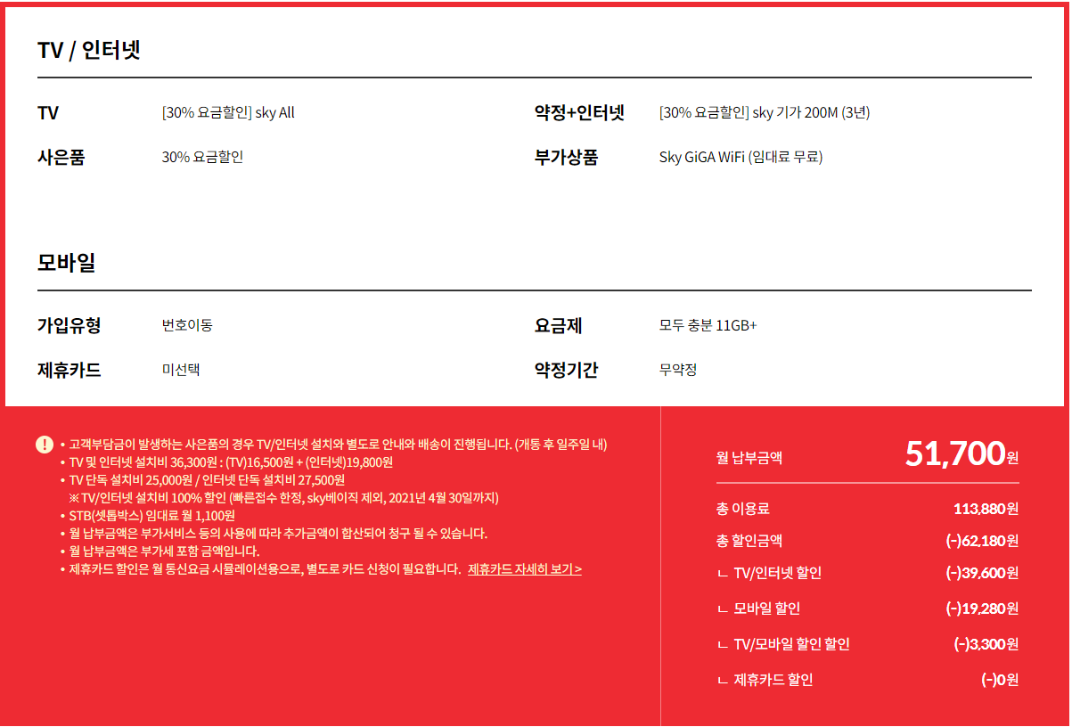 추가로 여쭤볼 게 있는데 알아본 바로는 kt 스카이라이프에 tv+인터넷+알뜰폰 결합하면 tv+인터넷(200mb)이 22000원이고 여기에 33000원 요금제를 합치면 추가로 3300원을 할인해 주더라고요. 총 가격(셋톱박스 임대료 포함52800원)입니다.