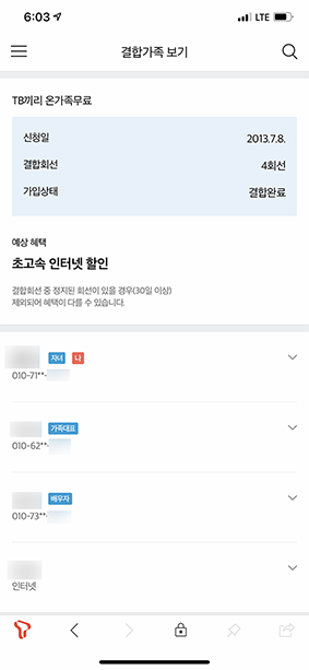 # 오! 현재 SK인터넷과 + SK휴대폰 3회선을 = '온가족무료' 로 결합중이시군요~?!