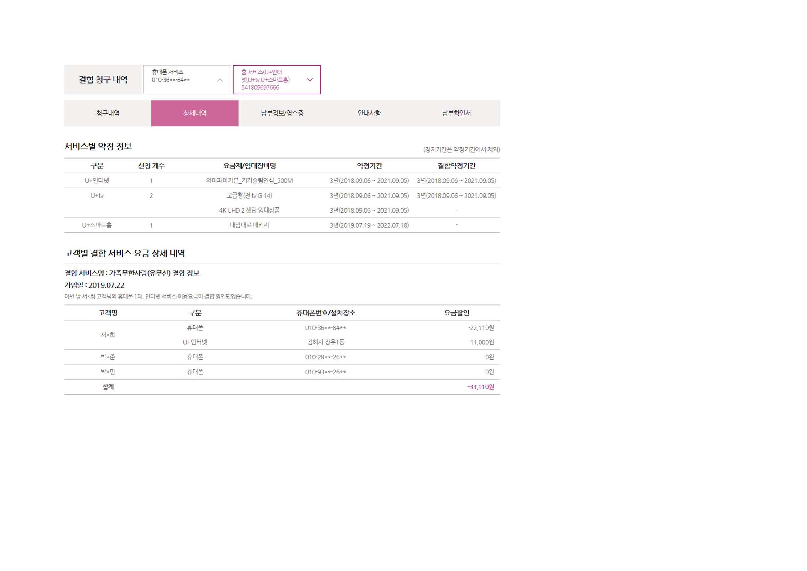이프 핸드폰 U+  / 와이프 명의 인터넷   / 아들 핸드폰 U+