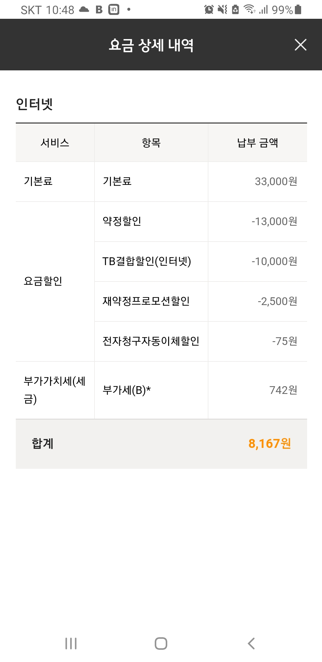 아래와 같이 인터넷 요금을 내고 있는데요