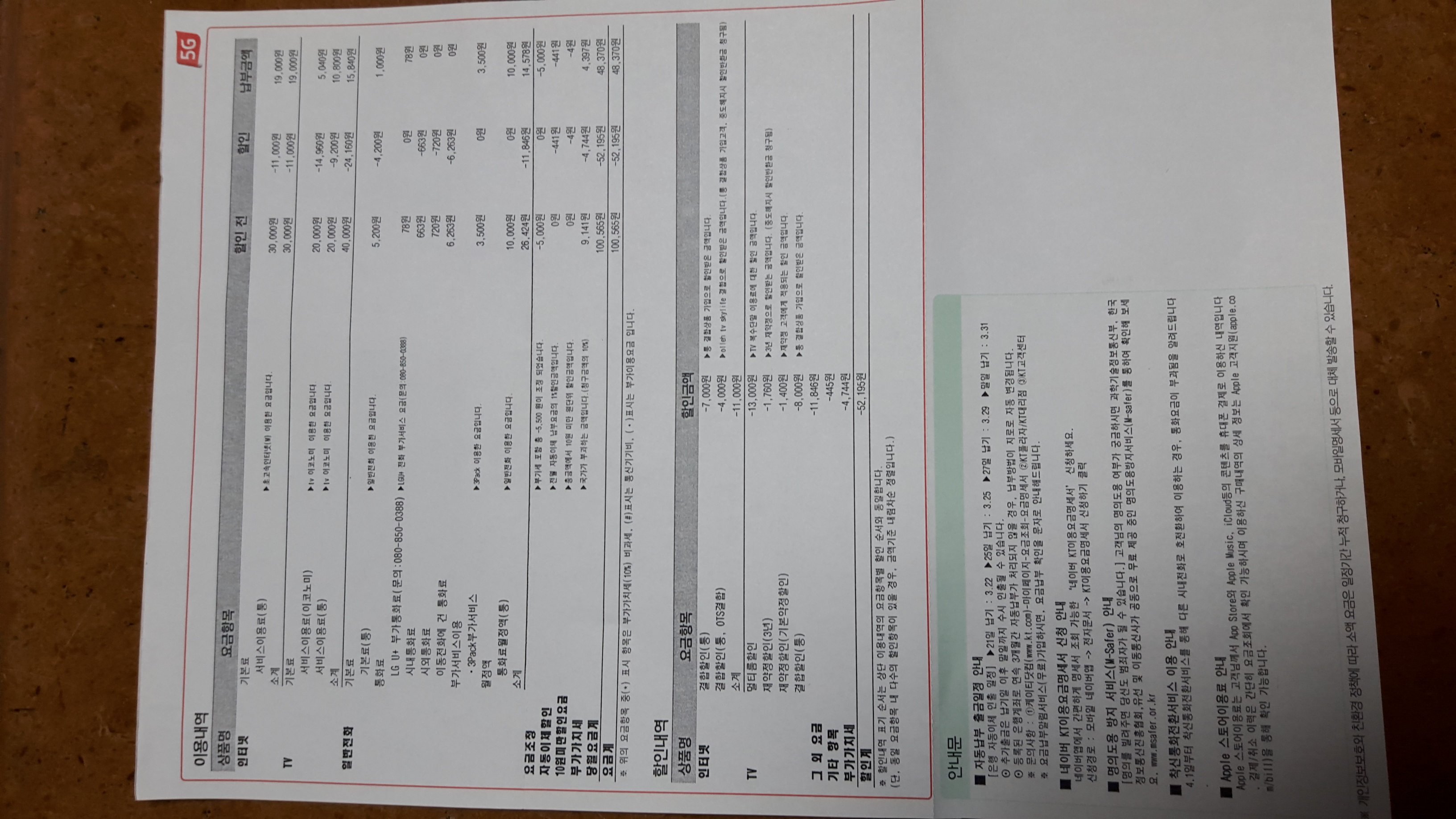 KT 인터넷, TV2대, 전화기 사용중이며 2월 요금이 48,370원 이네요.