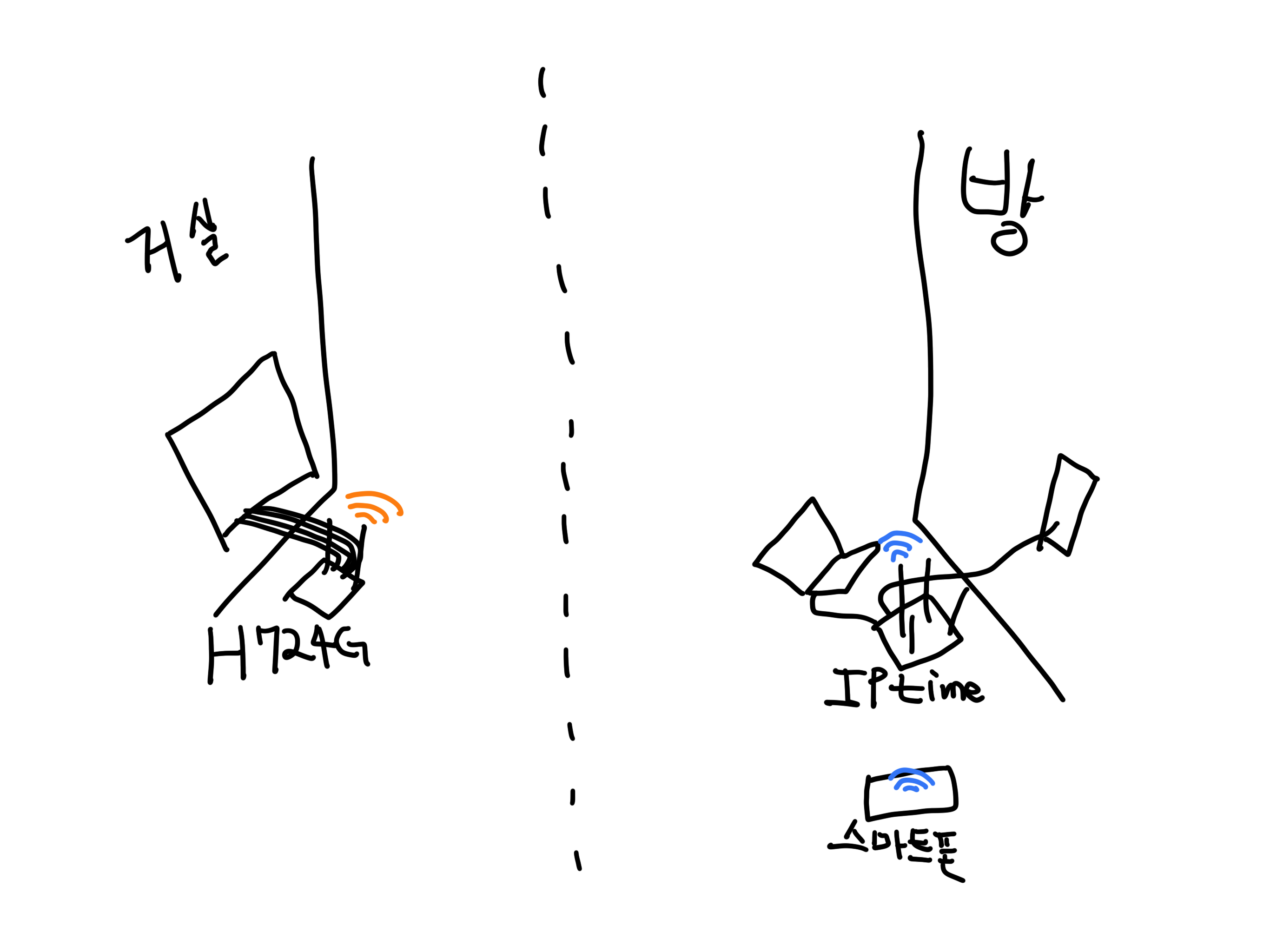 거실에 메인 인터넷이 설치가 되어있고 본선에 SK브로드밴드 H724G 모뎀을 연결하여 와이파이 환경을 만들어 놨습니다.