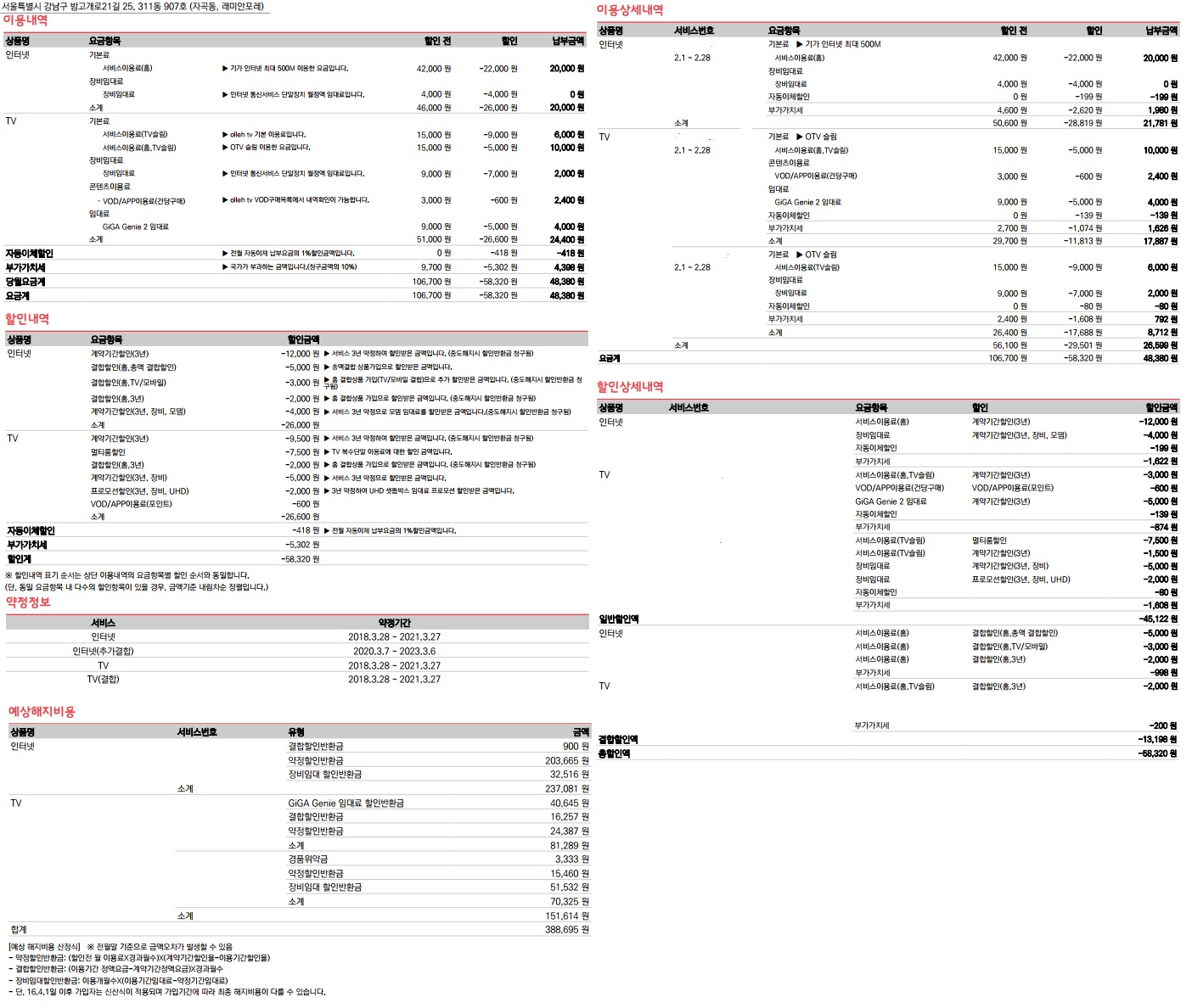 서브TV만 약정이 약 2년 정도 남아있고..! 나머지 상품은 이달에 약정이 만료되는 상황이군요~?!^~^*