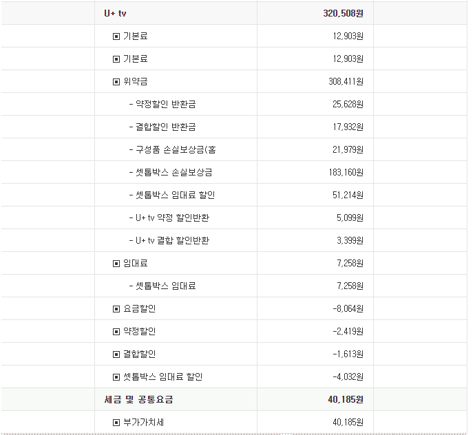 - 셋톱박스 손실보상금 183,160 을 제외하고 나면 최종 위약금은 442,044원입니다.