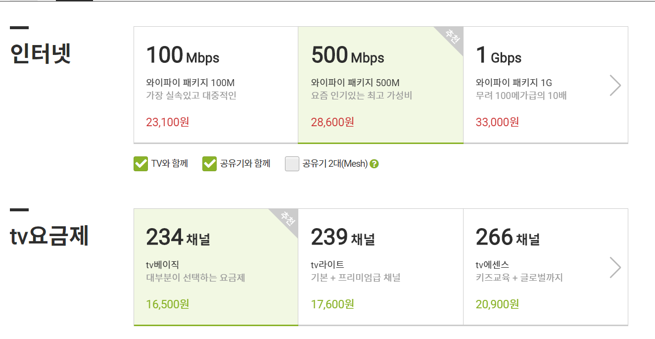 인터넷 요금제는 100메가/500메가 중 하나를,