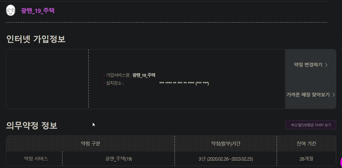 해지를 알아보려고 유플러스 사이트에 들어가 조회해보니 작년에 어머니께서 가게에도 인터넷을 까시면서 같이 재약정을 하신 것 같습니다.