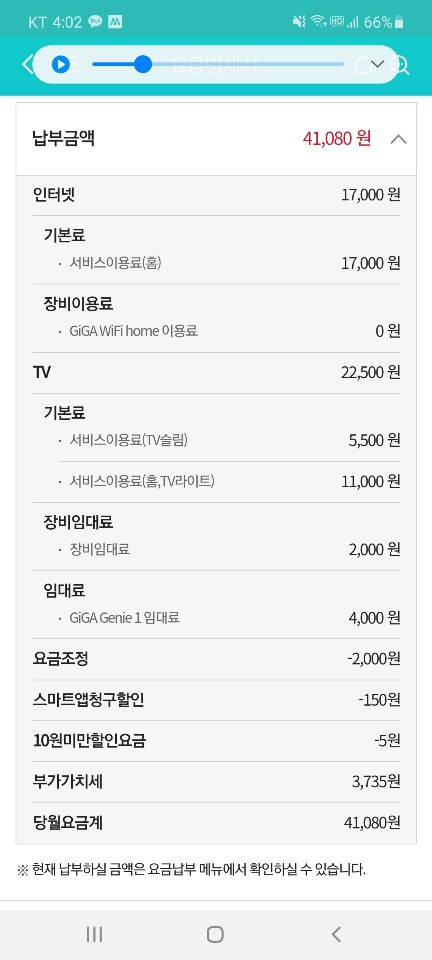 일단 기가지니1임대료는 6,600원인데 4,400원에 이용하신 것으로 미루어보아