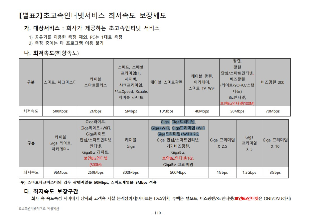 "Giga인터넷 프리미엄 상품 및 10Giga 인터넷 계열 상품 이용 고객이 이전 설치로 인하여 동일 등급(Giga인터넷 프리미엄 및 Giga 프리미엄X 2.5, Giga 프리미엄X 5, Giga프리미엄X 10 인터넷 상품) 의 서비스를 제공받지 못하는 경우"