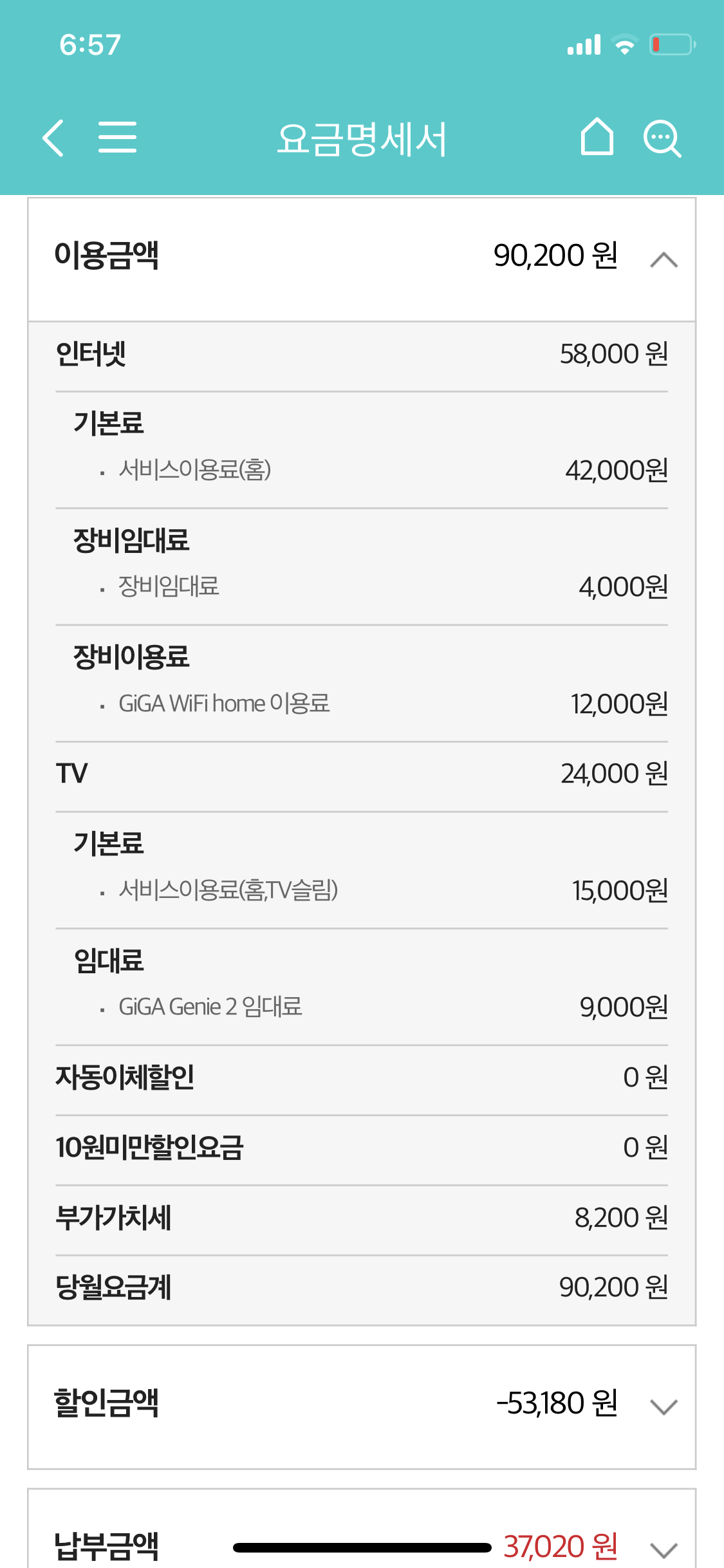 그래서 총액 결합할인으로 (모바일2 + 기가인터넷 500M + TV)로 약 6만원 이상을 할인받아서 6만원 정도의 요금을 내고 있습니다.
