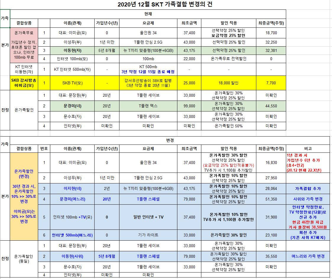 여기에 KT를 해지하고 제 명의로 SK 인터넷 500mb (+ TV는 추가여부 고려중) 추가하여 휴대폰 3회선, 인터넷 2회선을 온가족무료에서 온가족할인으로 변경하고 싶습니다.