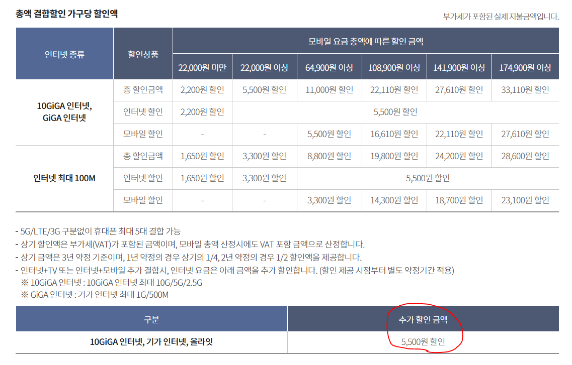 = 총액 51,700원 - 22,110원 (108,900원 이상구간 총액결합할인) - 5,500원 (기가인터넷 추가할인 / 해당부분 아래 사진첨부)