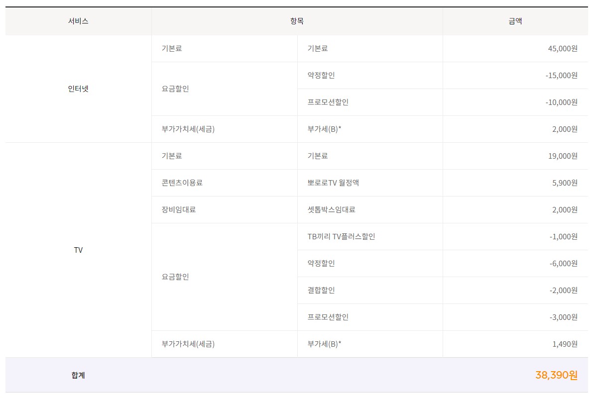 사용 상품은 기가인터넷 라이트(인터넷) + 스마트(IPTV) 사용중이고 약정이 만료되어 무약정으로 사용중입니다.