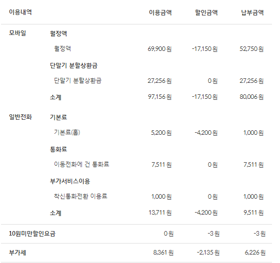 - 집전화 : 가입일자 1997년 3월, 이용기간 23년 9개월, 상품명 '일반전화' 5,200원짜리