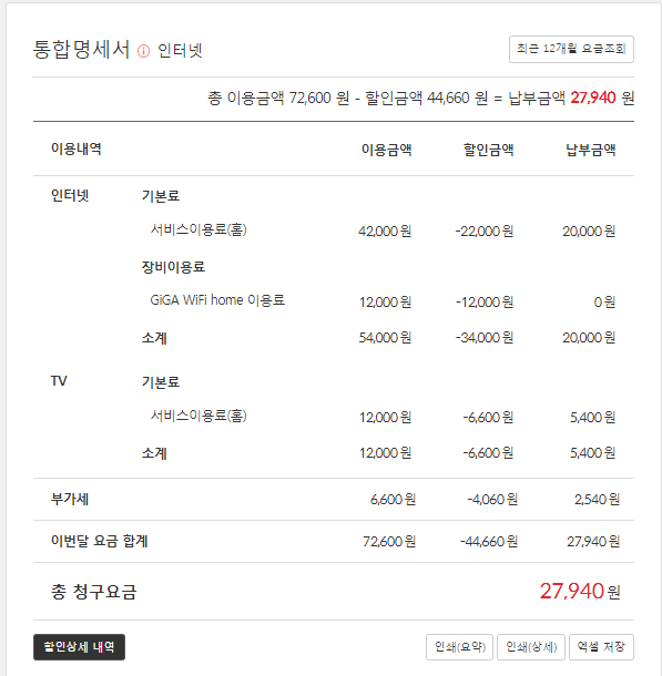인터넷/TV 할인상세내역