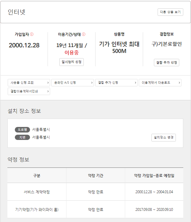 - 인터넷 : 가입일자 2000년 12월, 이용기간 19년 11개월, 상품명 '기가 인터넷 최대 500M' 42,000원짜리