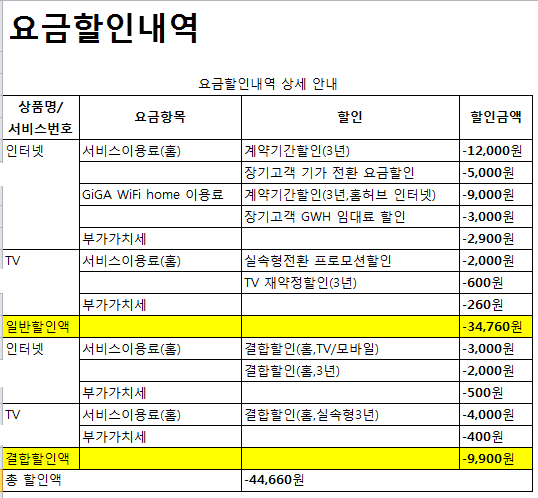 1.인터넷 : 서비스이용료(홈) 계약기간할인(3년) -12,000 , 장기고객 기가 전환 요금할인 -5,000,