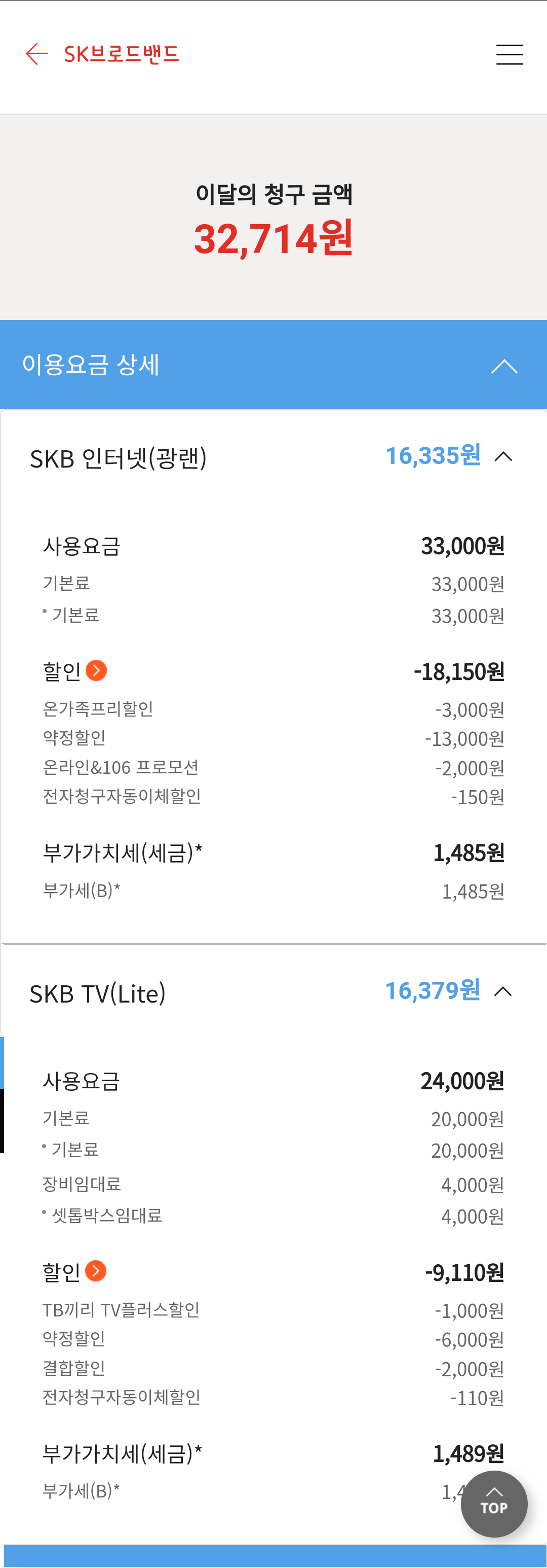 (인터넷 25,300원+TV 13,200원)이 합산 청구되어요.