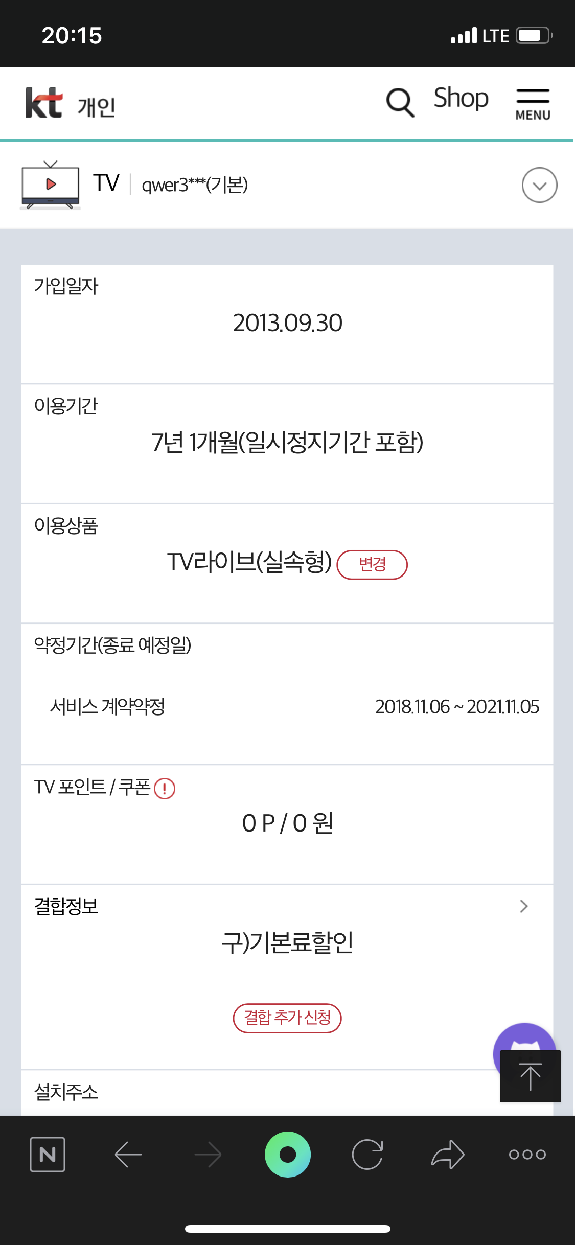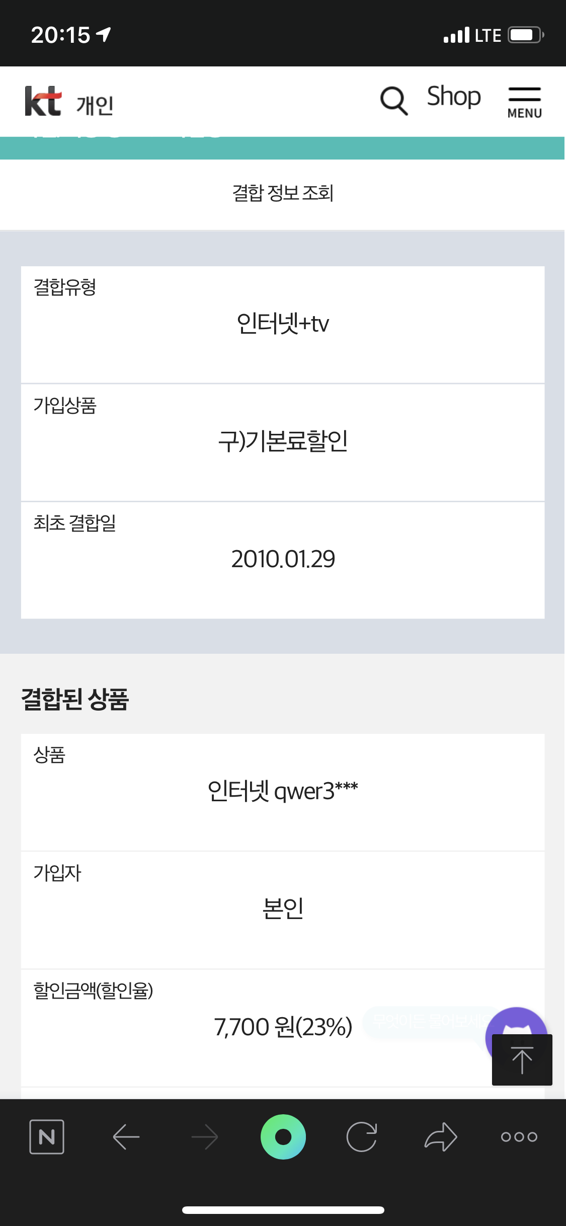 현재 인터넷+TV 구) 기본료 할인 결합 상태이며