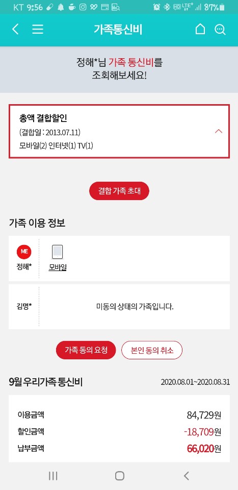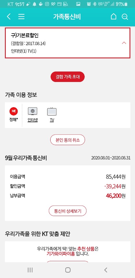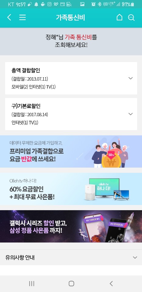 - 제 명의의 인터넷+TV는 구)기본료할인 결합으로 되어 있습니다.