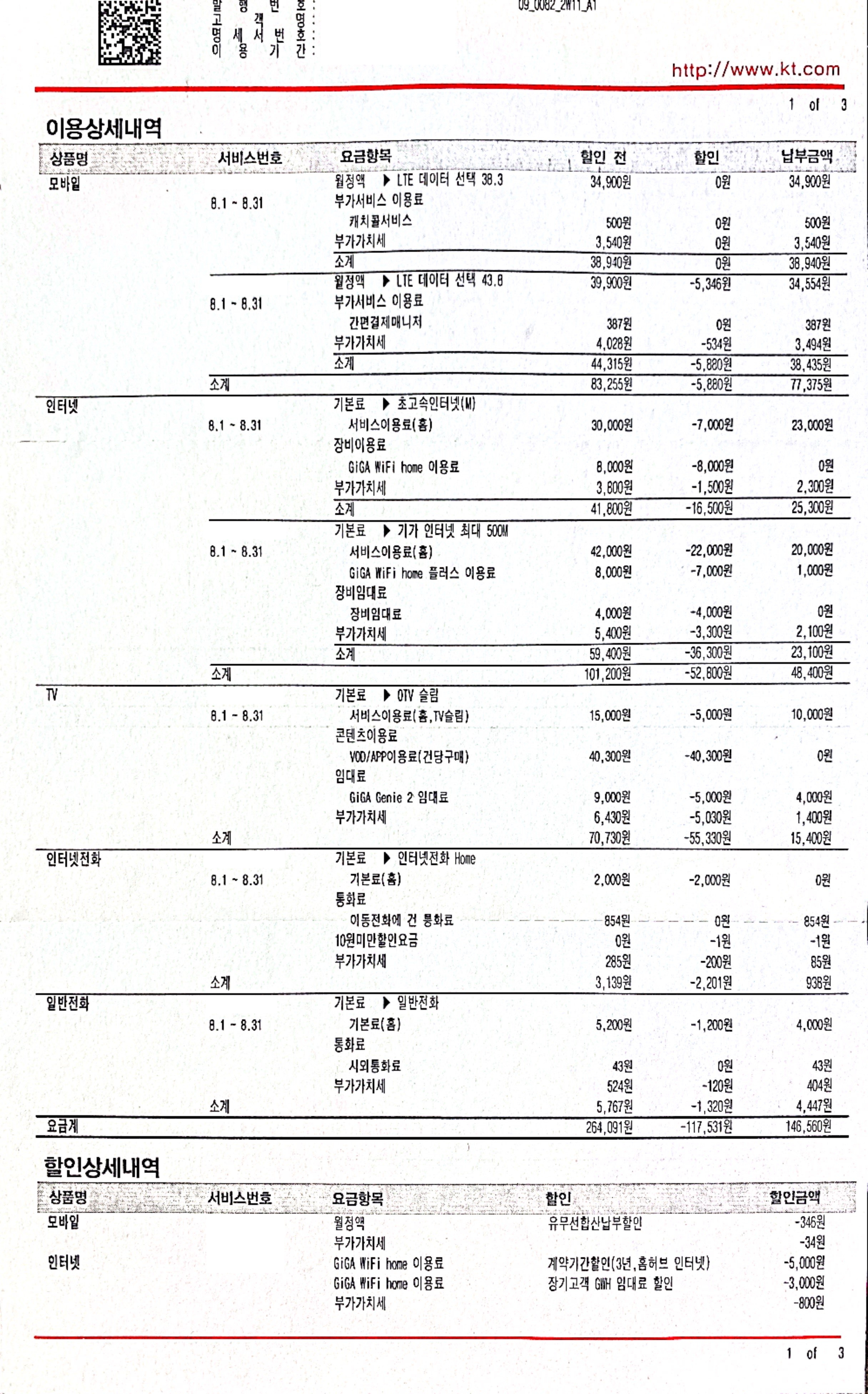 1) KT휴대폰 2대 (38.3 + 43.8 요금제)