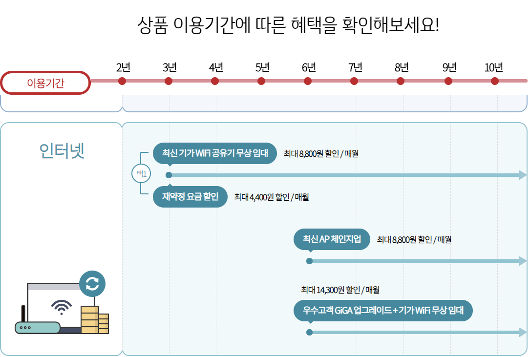그리고 홈페이지에 보니 장기 이용 혜택에 4,400원 할인 대신에 최신 기가 WIFI 공유기 무상 임대가 있어서 이걸 물어봤더니 이건 장기 고객 할인으로 들어가야되서 포함이 안된다고 굳이 업그레이드 하려면 매달 1,100원씩 내야된다던데 사실인가요? 홈페이지에는 택1이라고 적혀있어가지고 물어본거거든요ㅎㅎ;